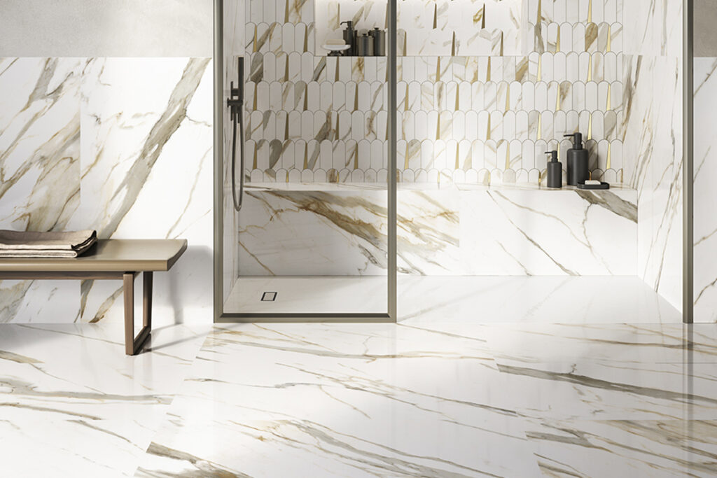 Выбор форматов 80х160 см и 120х278 см оказался стратегически верным решением для создания цельного и гармоничного покрытия. Минимальное количество укладочных швов позволяет мраморному рисунку раскрыться в полной мере, создавая впечатление монолитной поверхности. Такой подход особенно эффектен в случае с Calacatta Gold, где каждая прожилка имеет значение для общей композиции.