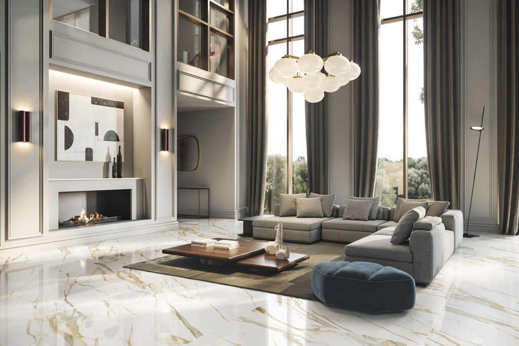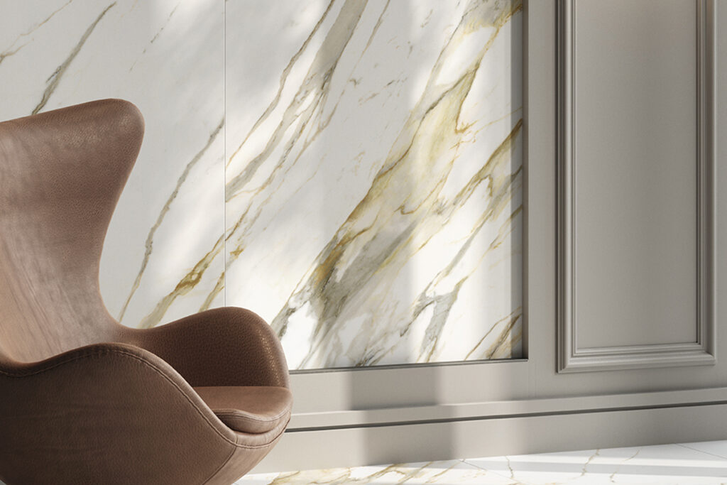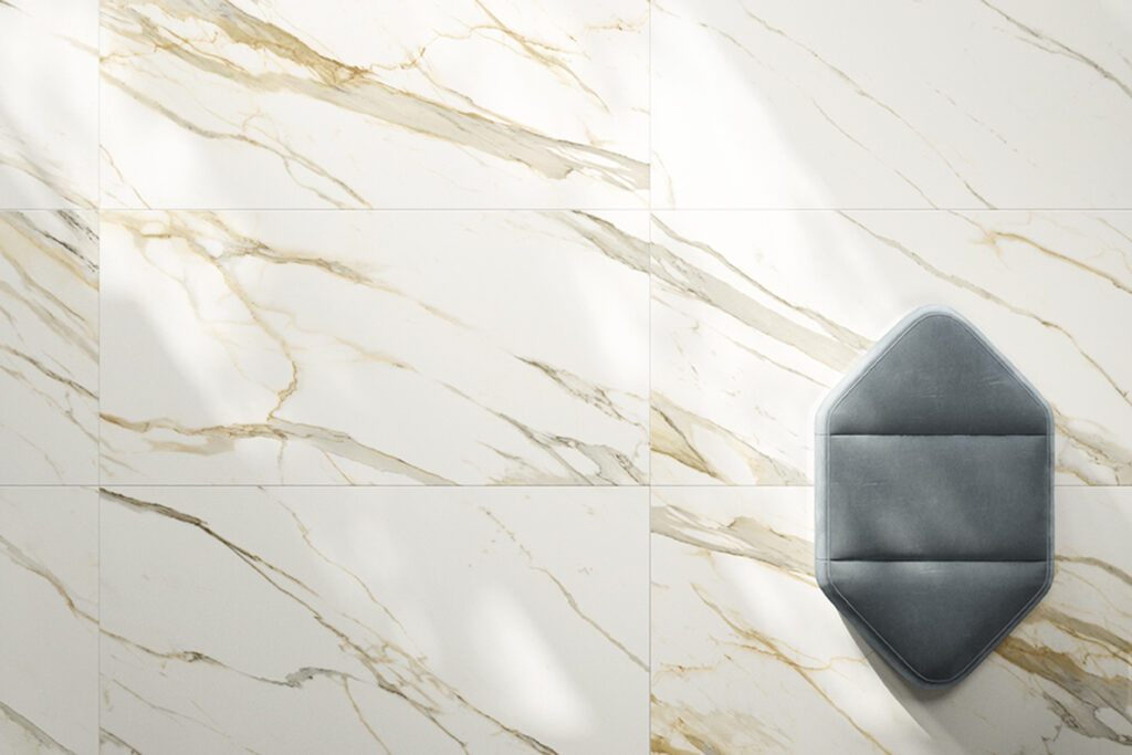 Керамогранит Калакатта Голд из коллекции Stellaris стал главным героем этого интерьера, продемонстрировав всю красоту и выразительность мраморной текстуры. Золотисто-бежевые прожилки, словно солнечные блики, пронизывают светлую основу, создавая удивительную игру оттенков и переходов. Эти мягкие линии рождают ощущение естественной гармонии, которое мгновенно считывается на подсознательном уровне.