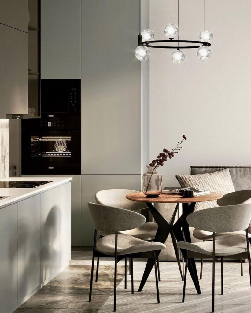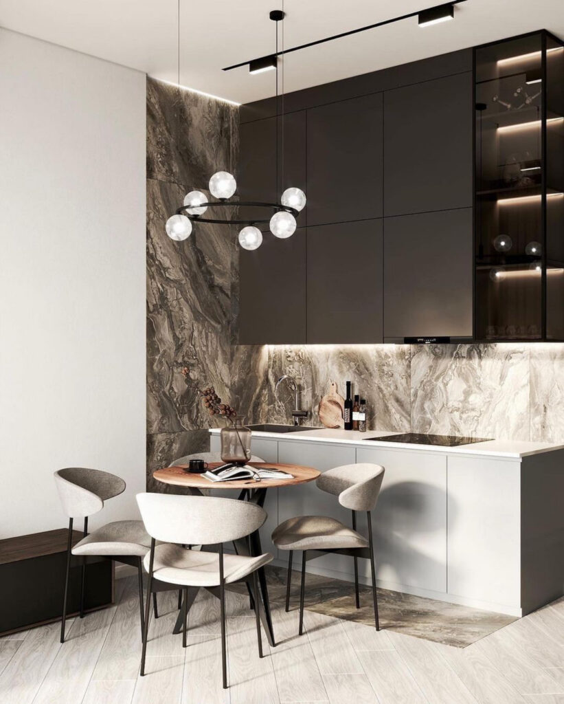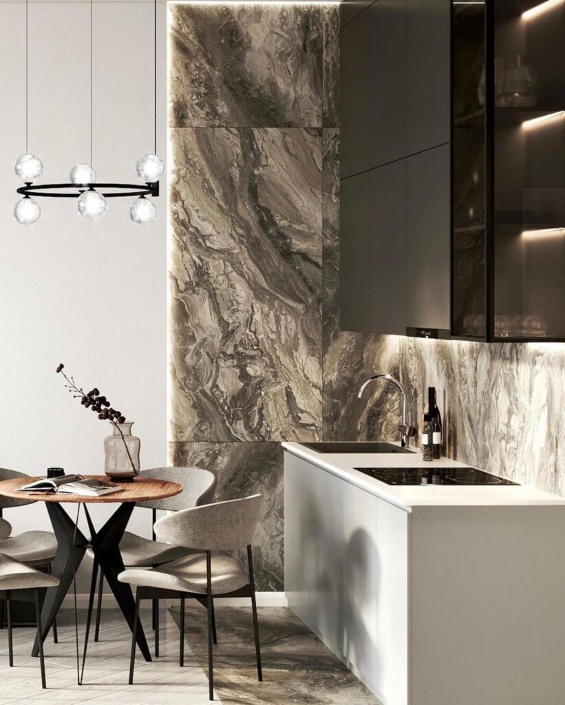 Двухцветное решение кухонных фасадов становится идеальным компаньоном для выразительной мраморной текстуры. Контраст светлых и темных поверхностей подчеркивает красоту каменного рисунка, создавая динамичную, но сбалансированную композицию. Такое сочетание позволяет избежать монотонности и добавляет интерьеру характер.