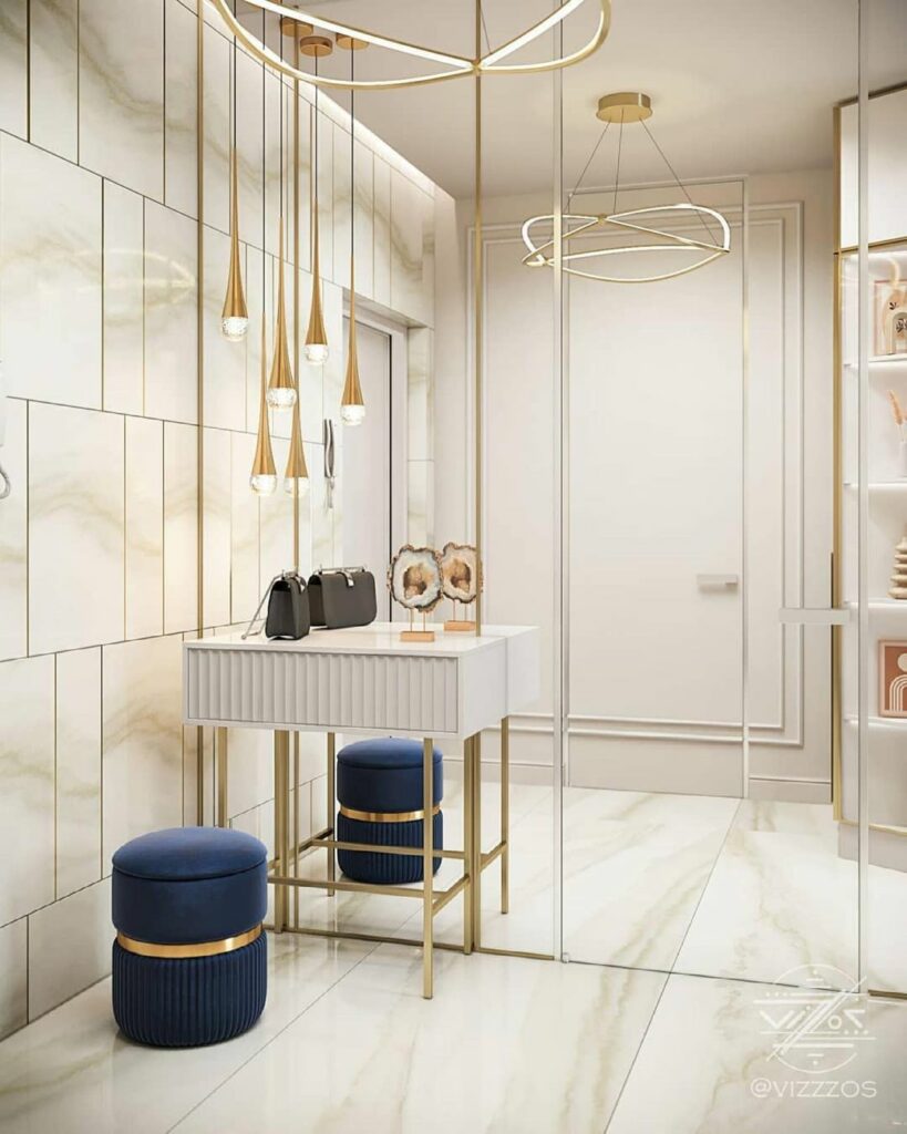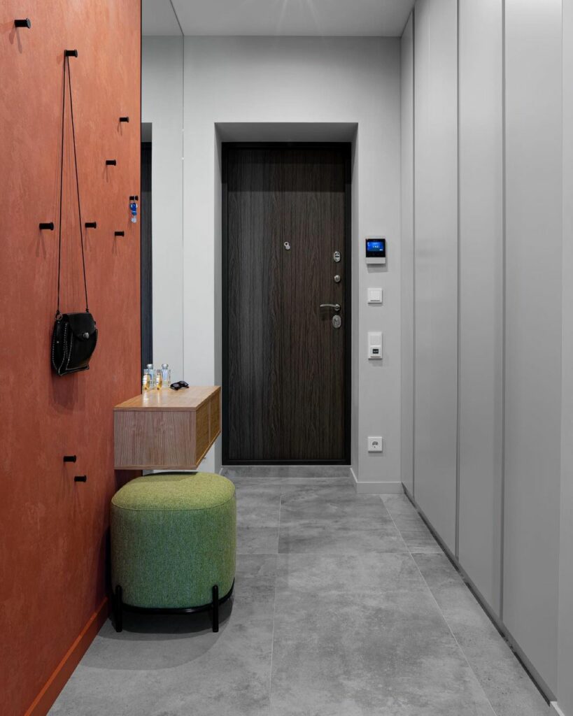 Терракотовая акцентная стена создает мощный визуальный удар уже на входе. Этот теплый, землистый оттенок наполняет пространство энергией и характером. Цвет обожженной глины ассоциируется с южными странами, средиземноморскими пейзажами и создает ощущение тепла. Ярко-салатовый пуф становится неожиданным компаньоном терракоте. Казалось бы, несочетаемые оттенки создают живую, динамичную композицию. Результат выглядит невероятно стильно и современно.