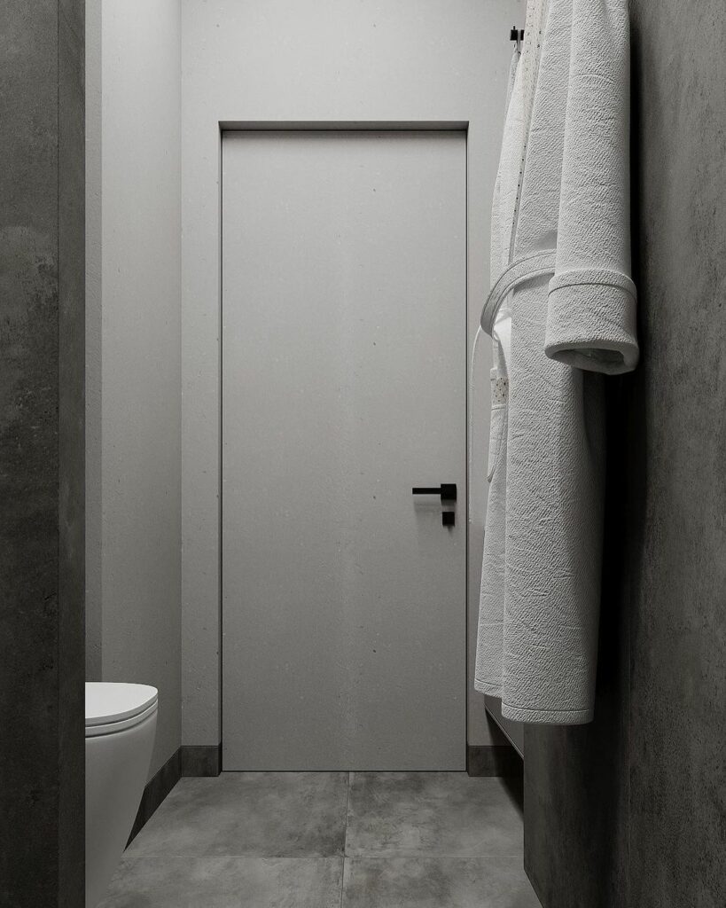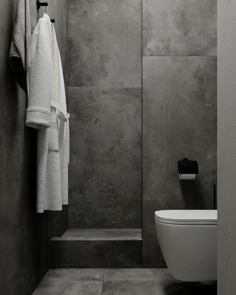 Комбинация керамогранита под бетон с настоящим микроцементом создает интересный материальный диалог. Микроцемент на стенах дает бесшовную поверхность с характерной текучестью рисунка. Керамогранит на полу привносит четкую геометрию и более выраженную текстуру.