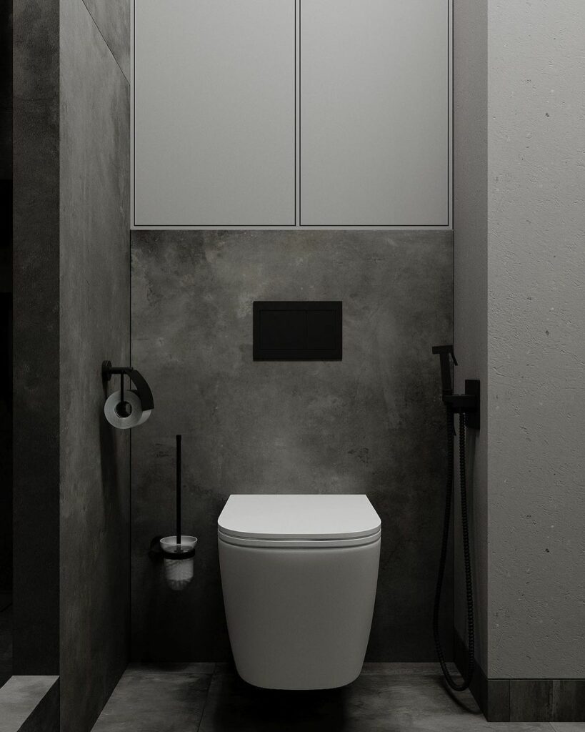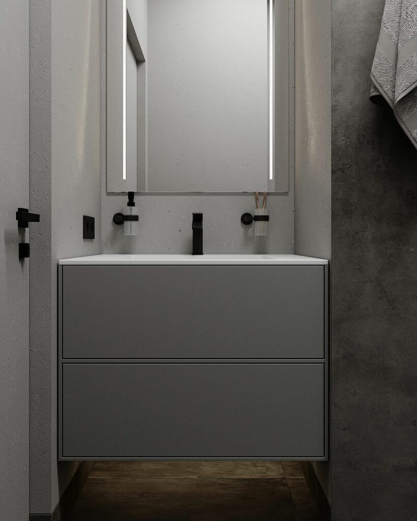 Фасады мебели продолжают монохромную линию интерьера. Отсутствие контрастных элементов создает визуальное спокойствие. Черная или темно-серая мебель сливается с керамогранитом, формируя единое пространство.