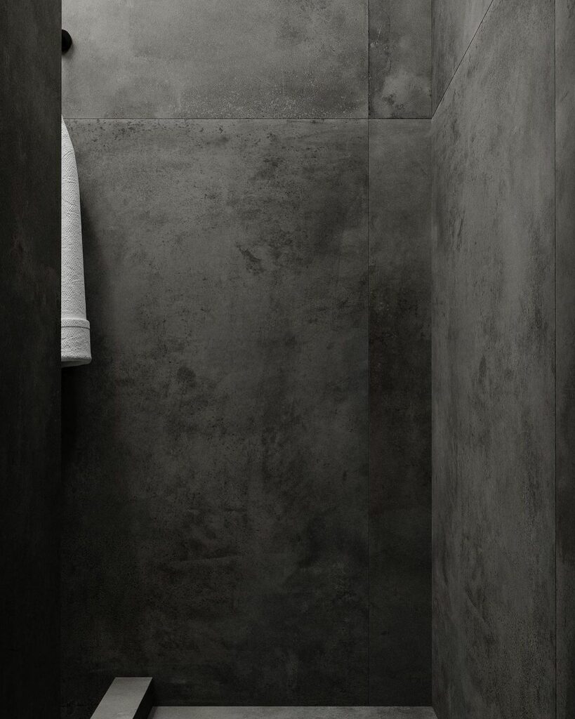 Формат 80×160 см минимизирует количество швов, что критично для восприятия бетонной текстуры как монолитной поверхности. Напольная плитка такого размера создает ощущение цельных бетонных блоков. При укладке на стены вертикальная ориентация визуально поднимает потолки.