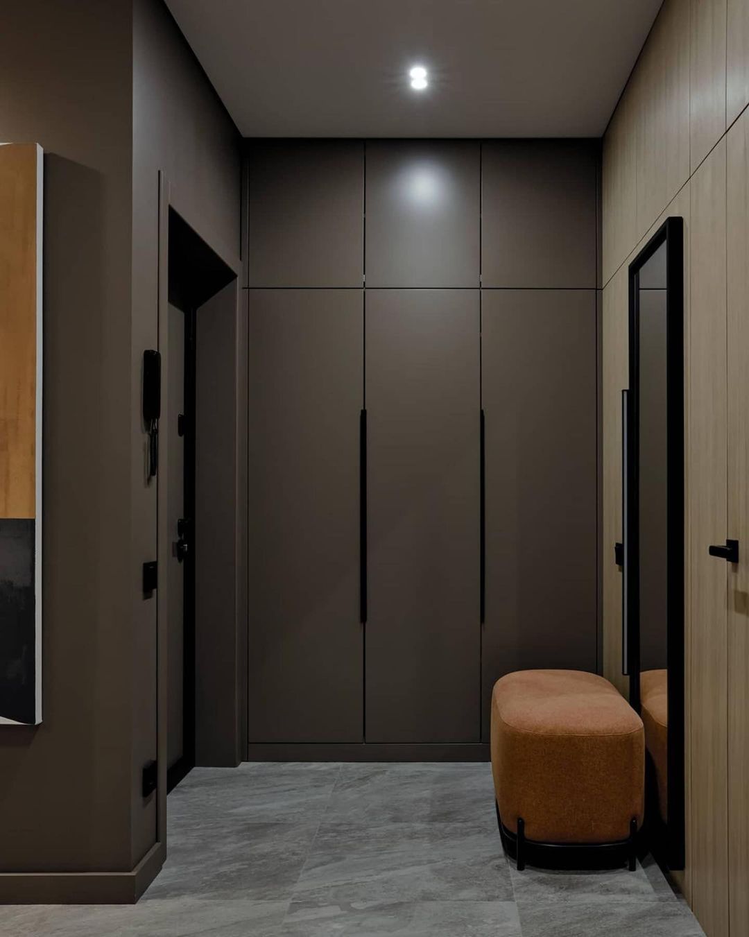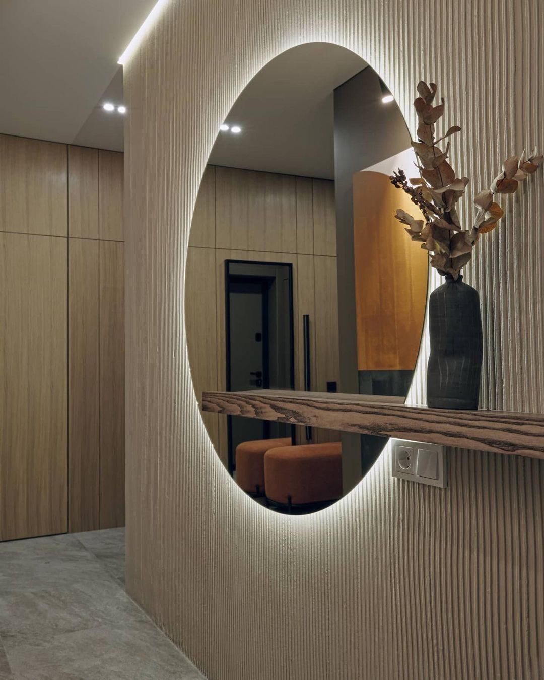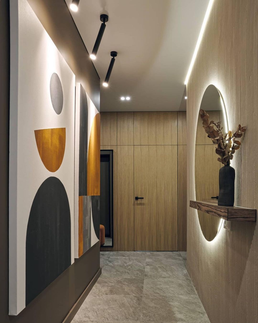Одну из стен оформили рельефной фактурой и разместили крупное круглое зеркало. Объемная поверхность добавляет коридору глубины, а зеркало работает как классический прием расширения — оно отражает свет и удваивает визуальное пространство. Напротив зеркала разместили яркие картины, которые стали композиционным центром прихожей.